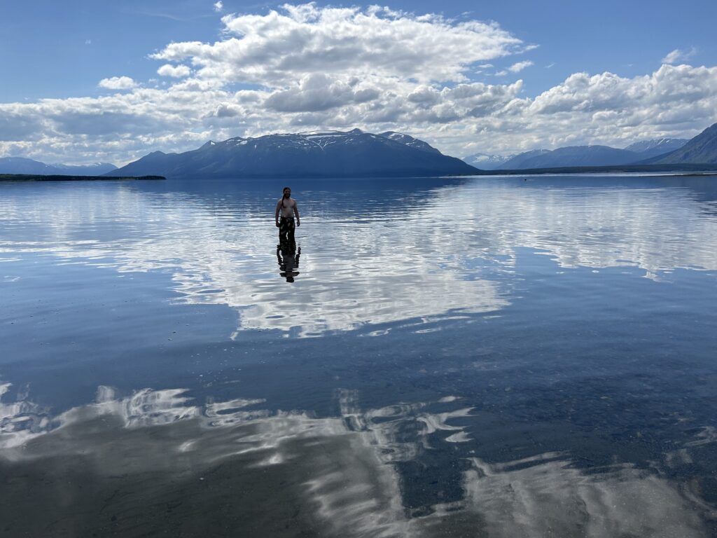 After a hot and sweaty hike, we felt that the beach was calling to us. I spent probably a half hour in the cold water of Atlin Lake – and loved (almost) every minute of it!