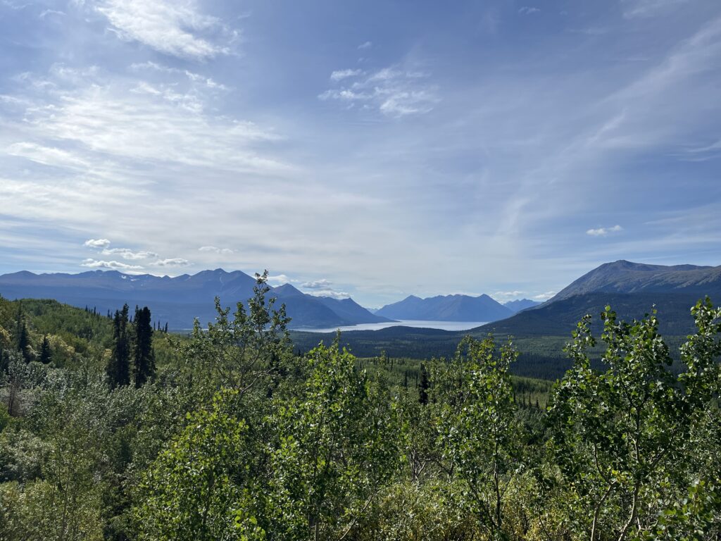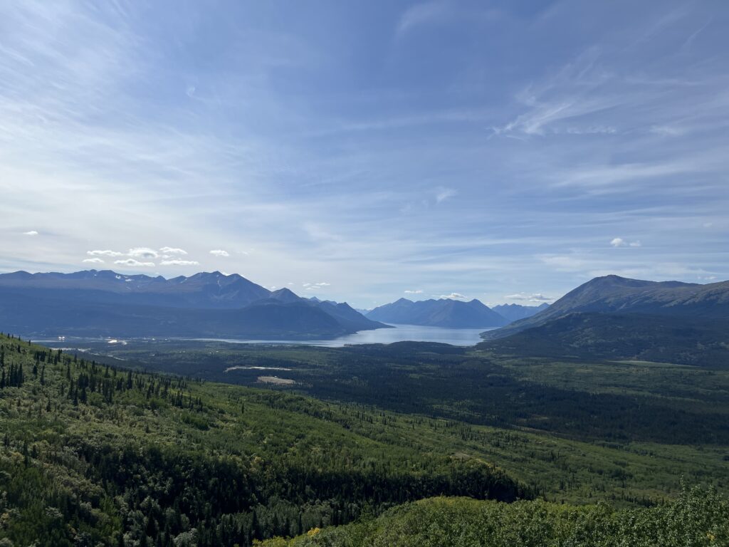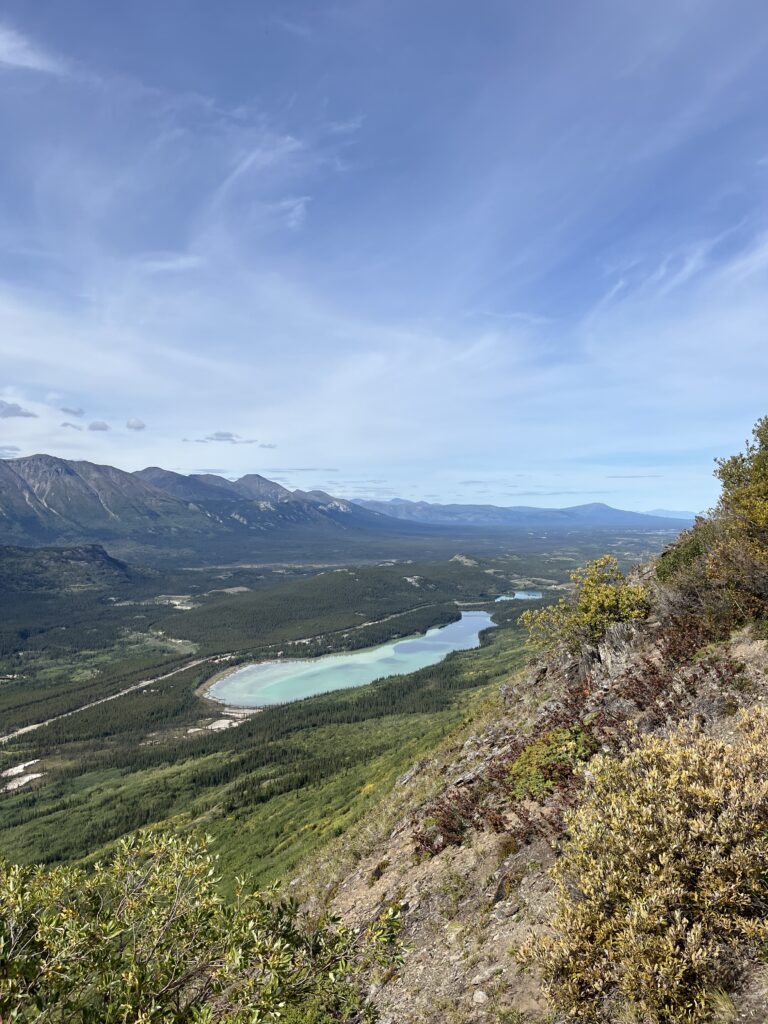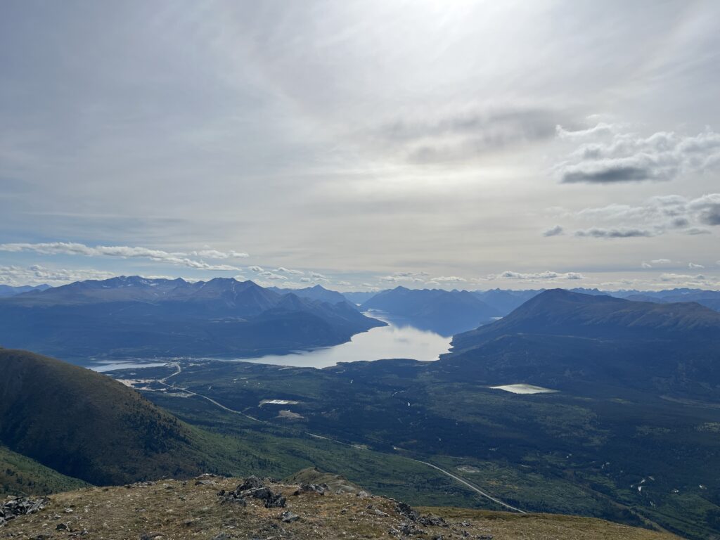 The morning was cloudy and a little wet, surprisingly, so we took off a little later than originally planned. Along the hike, you get views starting just as soon as you are above the main treeline. Here we are looking south towards Carcross and Lake Bennett.