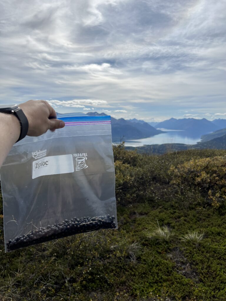 We stopped at the 500m gain mark to eat the amazing donut we got in Carcross and pick some crowberries.