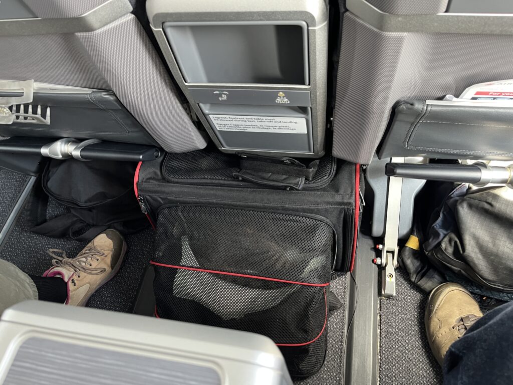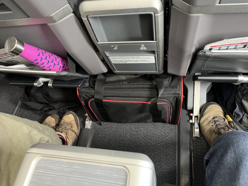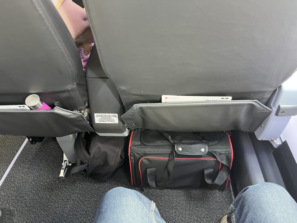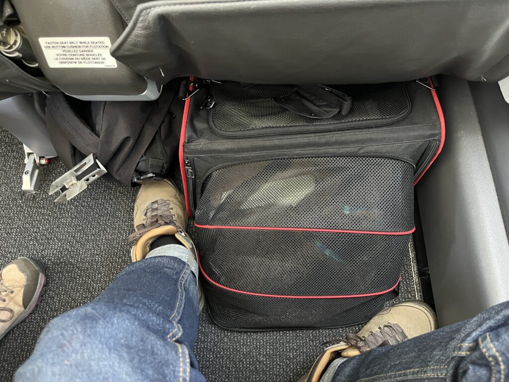 Here is Brunswick with the carrier zipped up underneath the seat in front of me. If you’re travelling with a pet, make sure you take the window seat!
