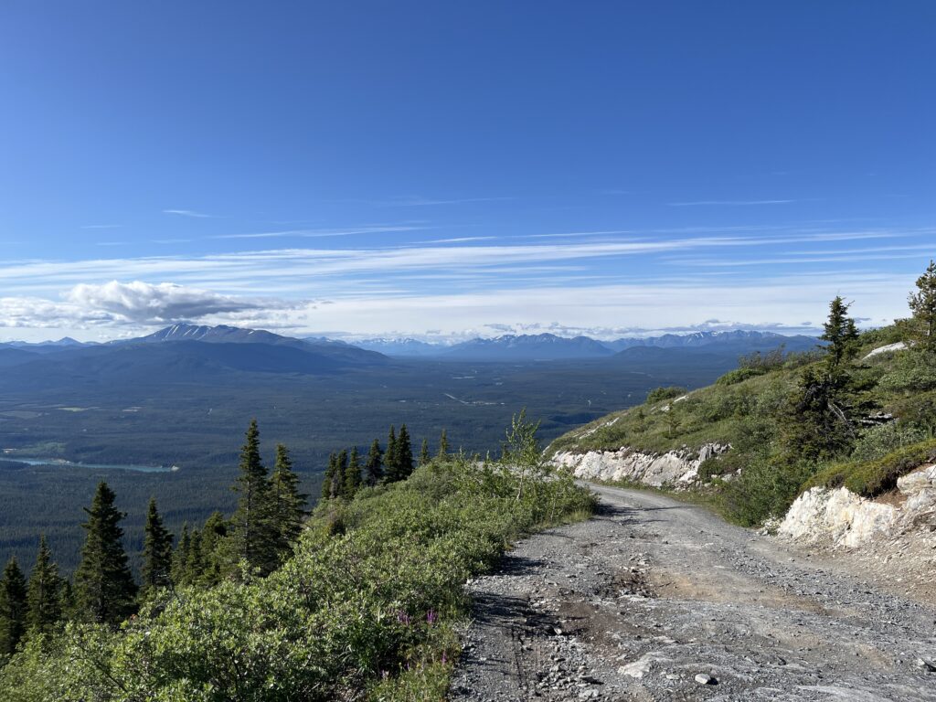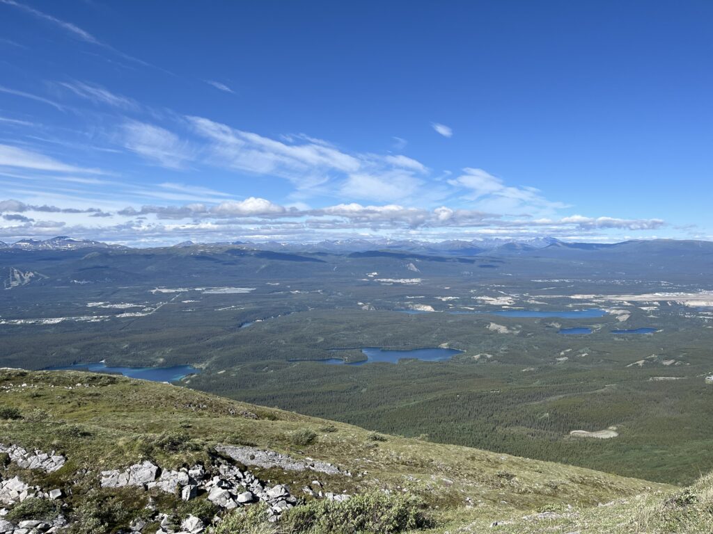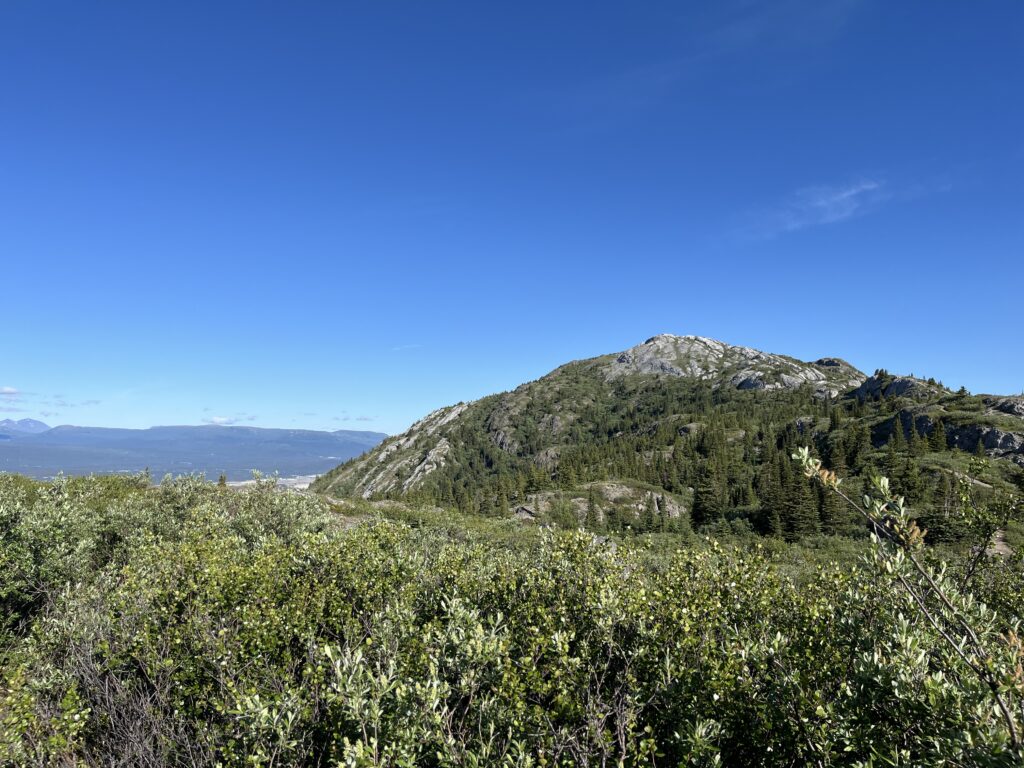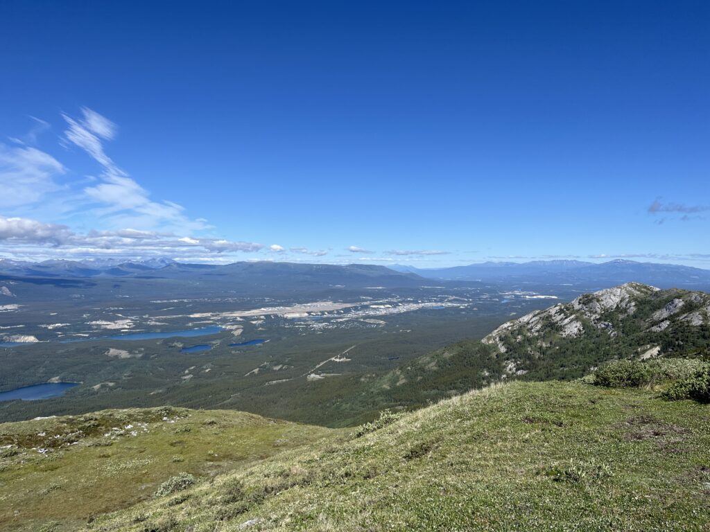 There are excellent views from the top of the mountain. You can see out to Marsh Lake, off to Whitehorse, and into the backcountry around Cantlie Lake.