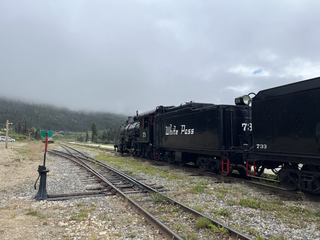 The White Pass was mostly clouded in on our voyage south, but we did catch up to White Pass & Yukon Route steam train #73 at Fraser. I was so excited! We quickly pulled off and spent about 15 minutes stopped taking pictures.